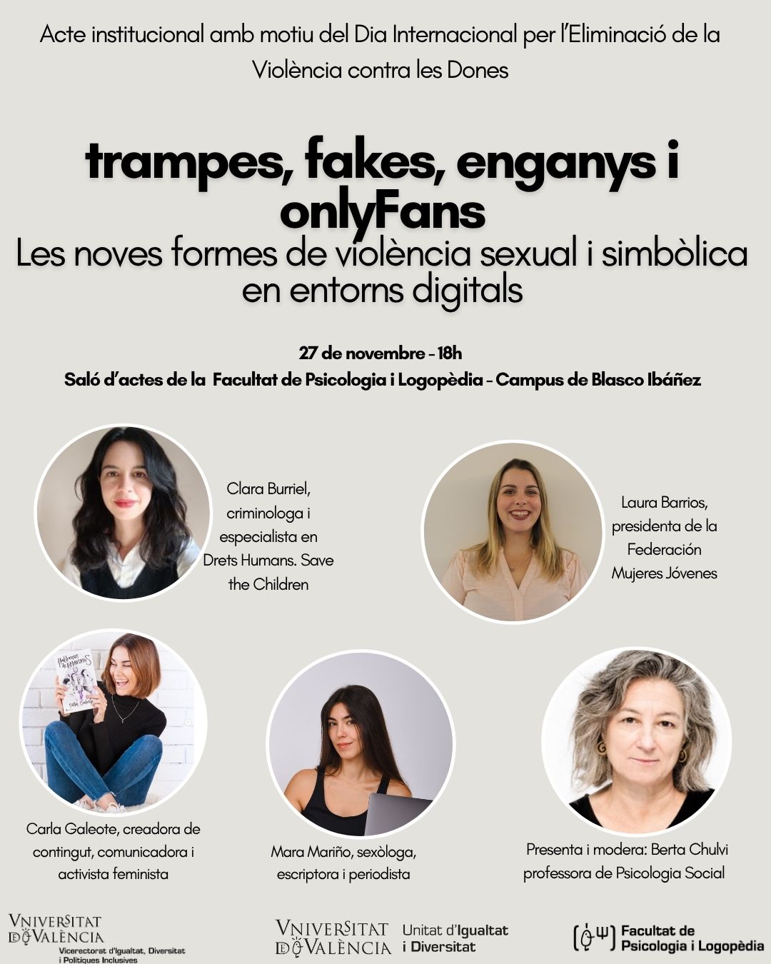Amb motiu del Dia Internacional per a l'Eliminació de la Violència contra les Dones, la Universitat de València organitza l'acte “Trampes, fakes, enganys i OnlyFans: les noves formes de violència sexual i simbòlica en entorns digitals”, que se celebrarà el 27 de novembre a les 18.00 h en la Sala d'actes de la Facultat de Psicologia i Logopèdia (Campus de Blasco Ibáñez).